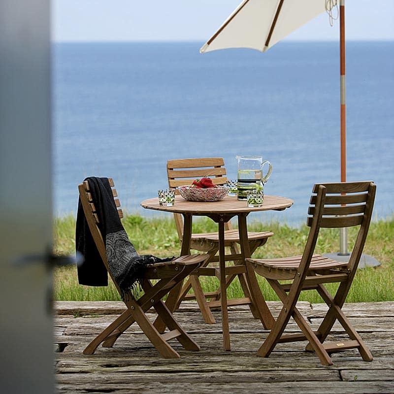 The Vendia Series is the gold standard here. Skagerak’s Vendia Chair and matching Table are masterclasses in the “bistro” style. Unlike cheap folding chairs that feel unstable, the Vendia is crafted from premium teak with curved slats. It provides a comfortable sit but can be folded and leant against a wall in seconds, so you can reclaim your patio for yoga, gardening, or just breathing room.